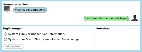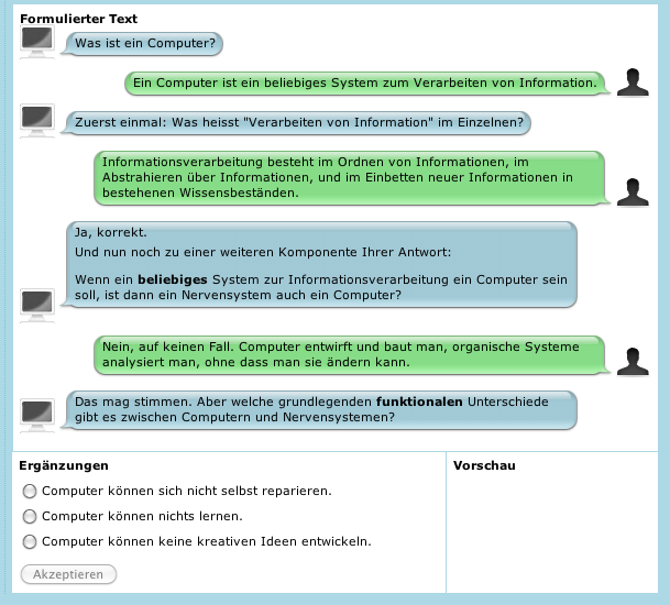 Nachdem ein erster, kurzen Antwortsatz zu Ende formuliert worden ist ("Ein Computer ist ein beliebiges System zum Verarbeiten von Information"), setzt das System mit einer ersten Nachfrage ein, um den ersten Aspekt der Antwort "abzuklopfen":