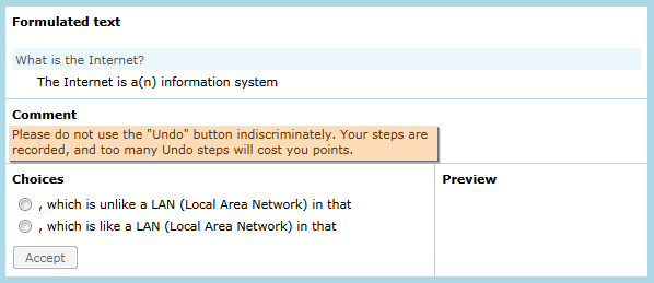 Natürlich wäre es möglich gewesen, diese Möglichkeit auf technischem Weg zu verhindern, aber die Erfahrung hat gezeigt, dass das Verhalten des Lerners in einer solchen Situation sehr interessante Einblicke in sein Wissen zulässt. Daher werden Korrekturschritte erlaubt, aber sie werden vom System protokolliert. Dementsprechend können darauf Bezug nehmende Kommentare ausgelöst werden (z.B. "Sie haben sehr viel herumprobiert – Ihr Wissen scheint noch nicht sehr gefestigt zu sein"), und erneut kann man den Lerner in einer formativen Situation danach in eine zusätzliche Übungsrunde steuern (via Anschlussfrage). In einer summativen Situation wird dieses Verhalten zu einem entsprechenden Punkteabzug führen.